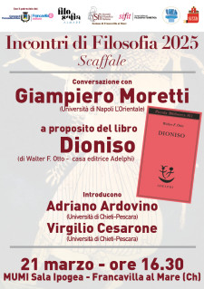 Venerdì 21 marzo, alle ore 16.30 presso il Museo Michetti di Francavilla al mare, Giampiero Moretti (Università di Napoli "L'orientale") terrà una relazione a partire dalla sua recente curatela del volume di Walter F. Otto dedicato a “Dioniso”. Introducono Adriano Ardovino e Virgilio Cesarone.